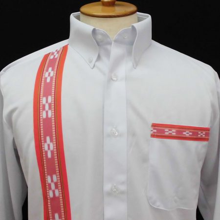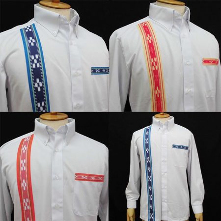 既成の白の長袖シャツに沖縄らしいミンサー柄を配色して、ホテルスタッフのユニフォームとしてアレンジしたものです。