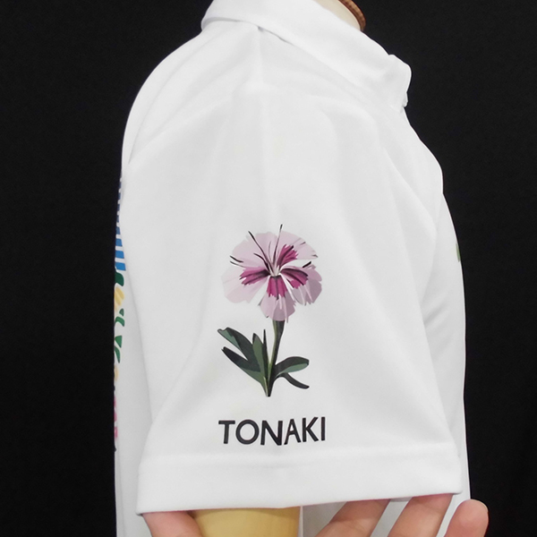 白でポリエステル100%の素材でしたので、右胸と背中は昇華プリントでプリントしています。